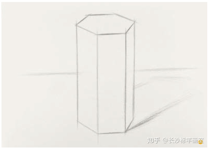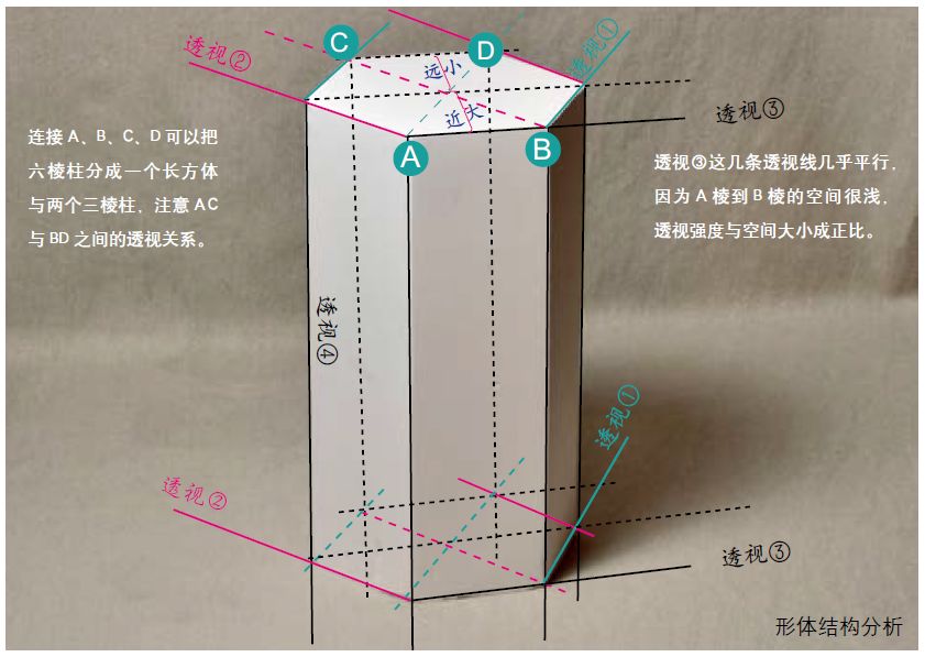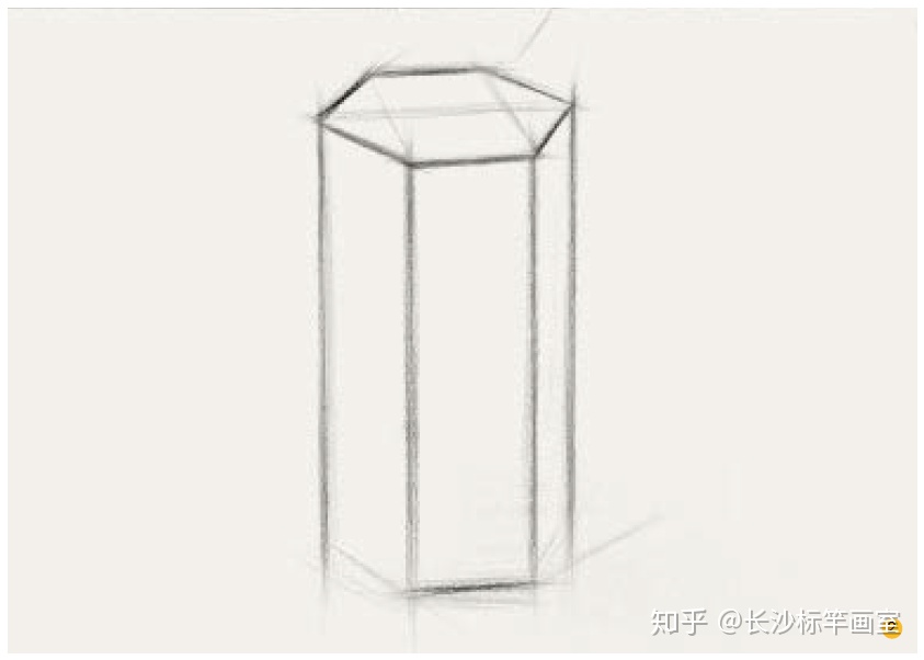 畫六棱柱時,上方的六邊形切面兩兩相對的六條邊線都因透視而產生變化??蓪⑾鄬膬蓚€點連起來,這樣更容易畫準其透視關系。