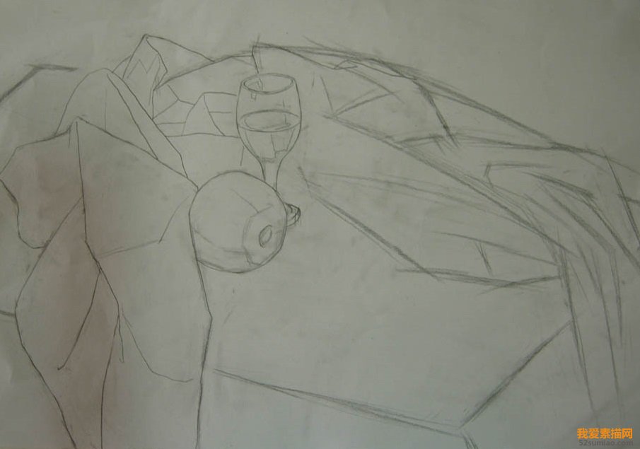 2、畫物體背光面和深色部分明暗。畫出靠近主體物的部分的背光面,襯布其它背光部分的明暗